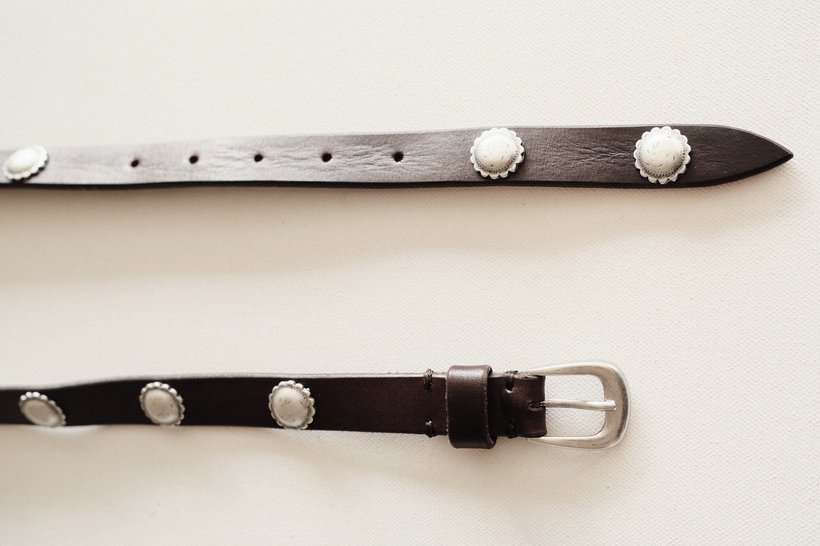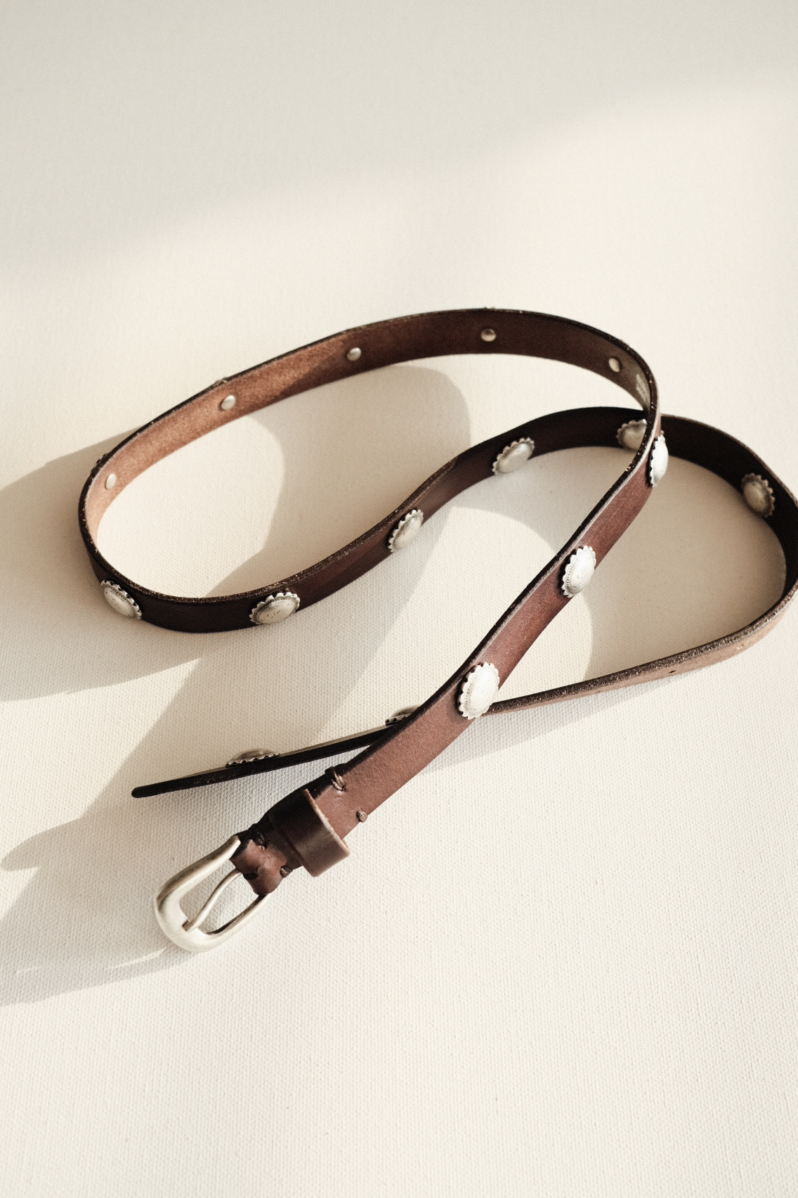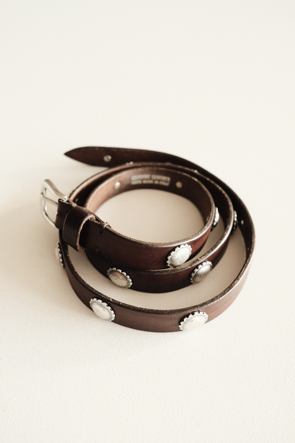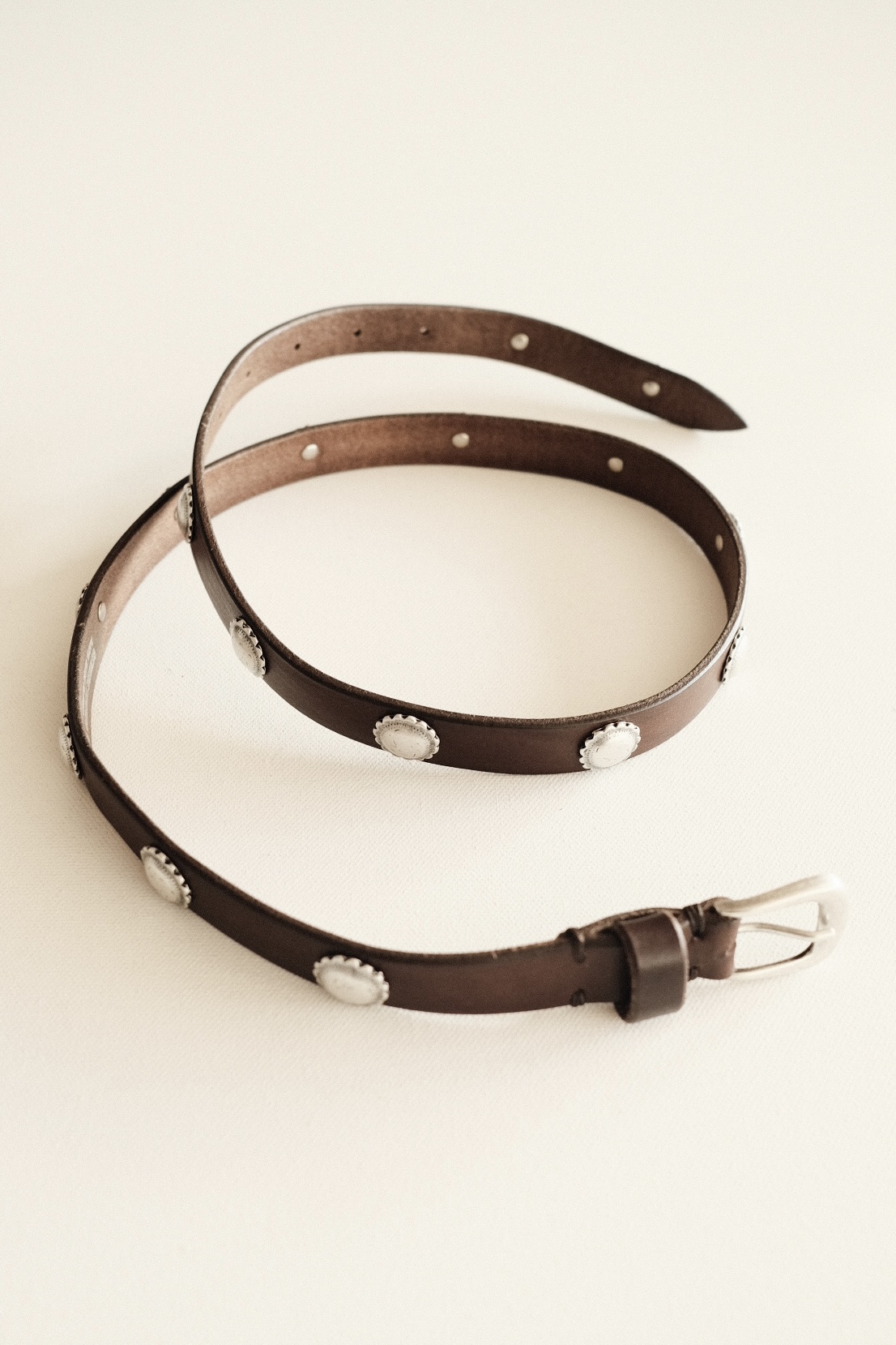 스트랩 부분에는 동그랗고 입체적인 메탈 플라워 콘초 장식이 수공예로 하나씩 리벳 고정으로 배열되어 핸드메이드 특유의 감성이 살아 있으며, 전체적으로 빈티지하고 클래식한 웨스턴 무드가 돋보이는 벨트입니다.