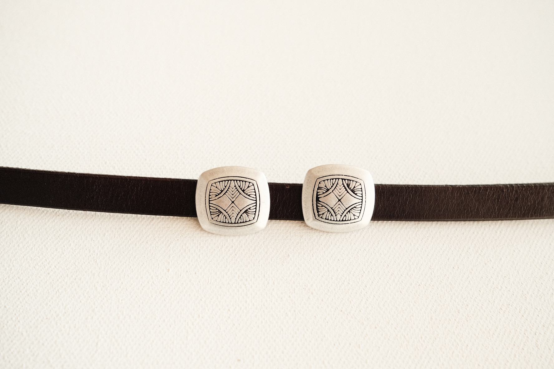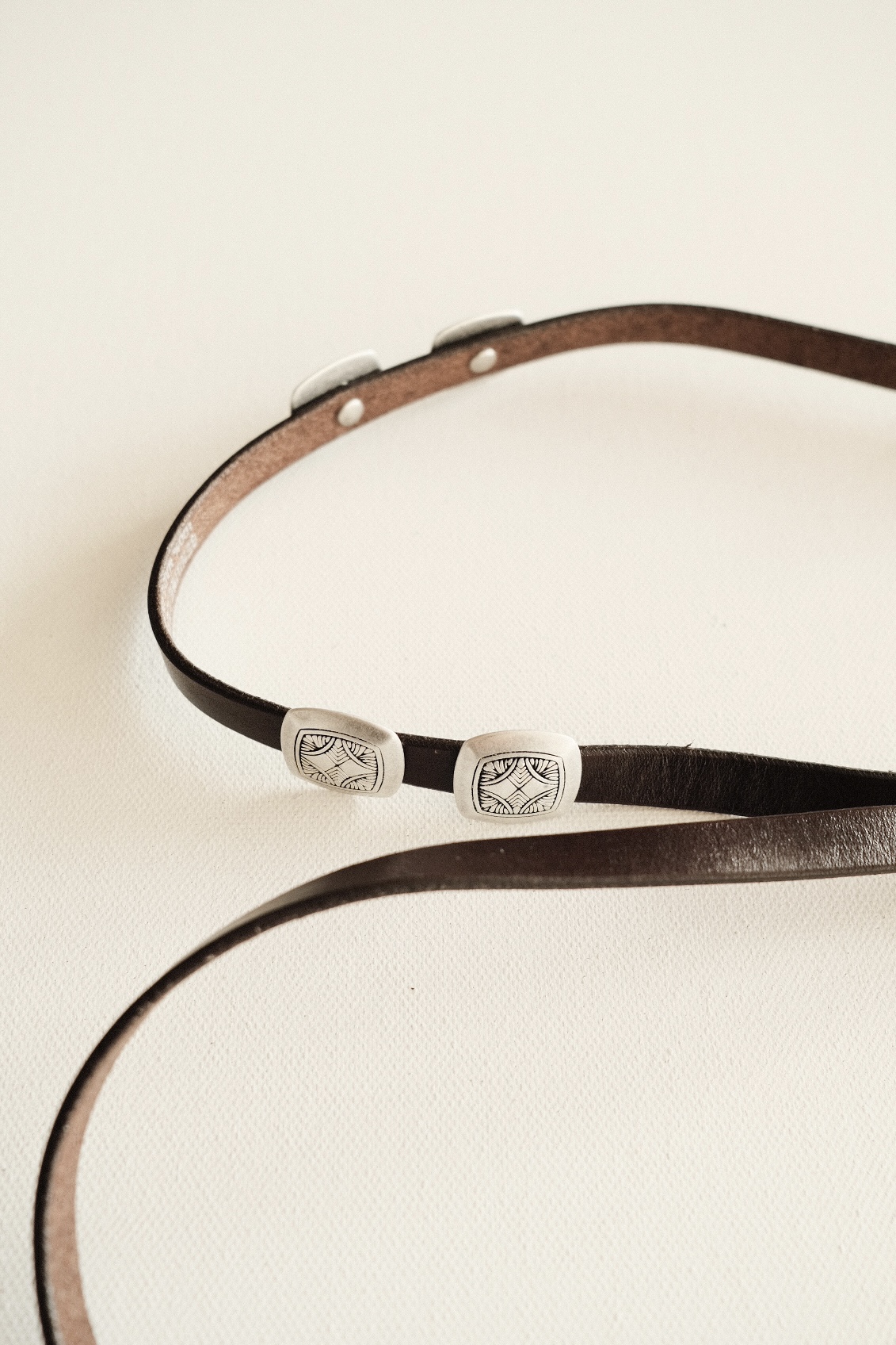 스트랩 부분에는 납작한 사각 메탈 콘초 장식이 리벳으로 규칙적으로 배열되어 있으며, 각 콘초에는 정교한 수작업 인그레이빙 문양이 새겨져 있어 섬세한 웨스턴 무드가 더욱 돋보입니다.